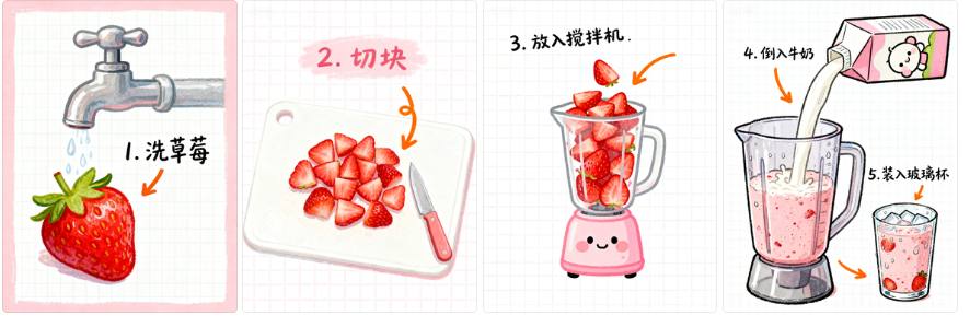 构图:竖版图,分 5 步骤,依次展示:洗草莓、切块、放入搅拌机、倒入牛奶、装入玻璃杯。