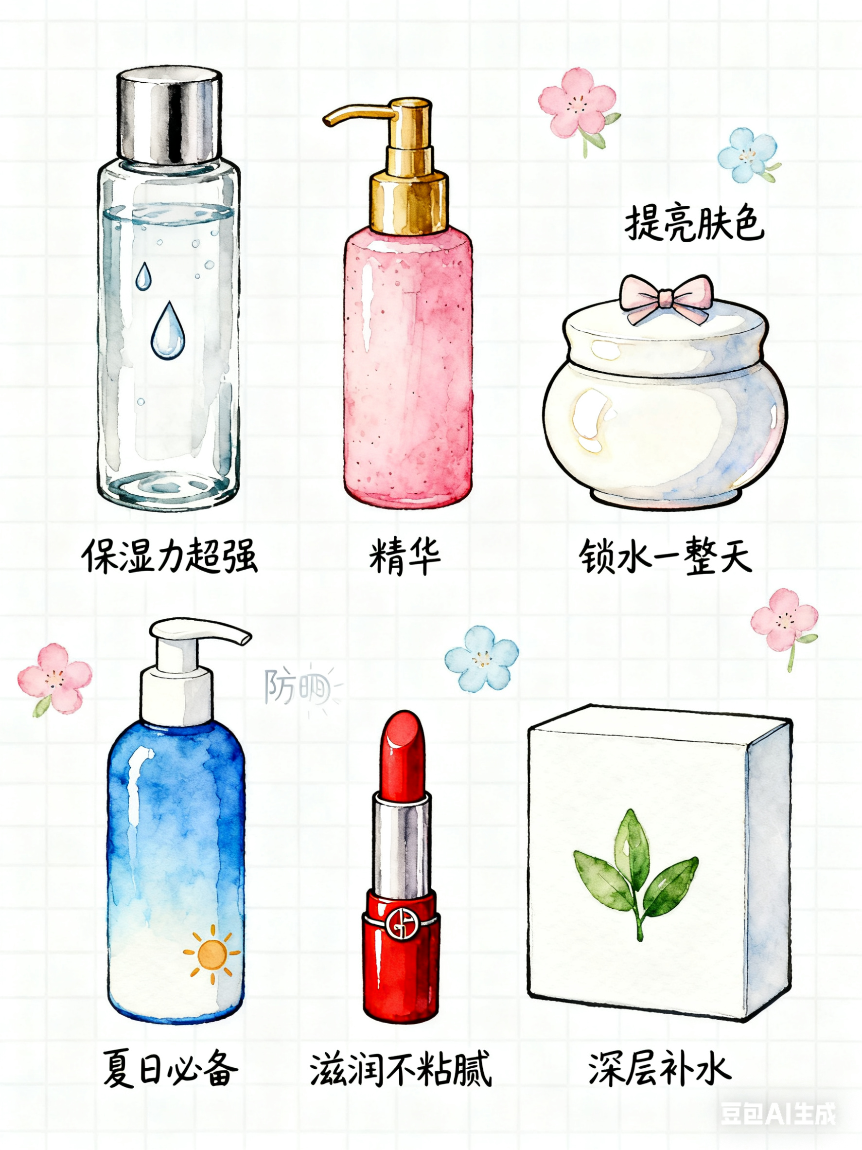 细节:每个瓶子旁边有可爱手写风说明,例如“保湿力超强”“夏日必备”。