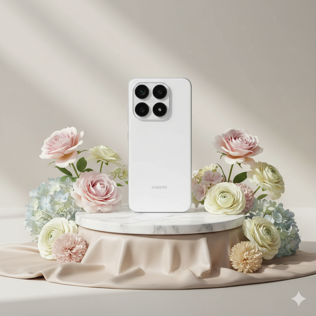 A high-end editorial photo of (IMAGE UPLOADED) placed on a white marble pedestal, resting on champagne-colored silk. It is surrounded by pastel flowers whose type and color naturally harmonize with the product’s primary colors (COLORS) — complementing and enhancing its tones. Soft natural light from the upper left. 3D realism, luxury product photography, shallow depth of field, 1:1 format.