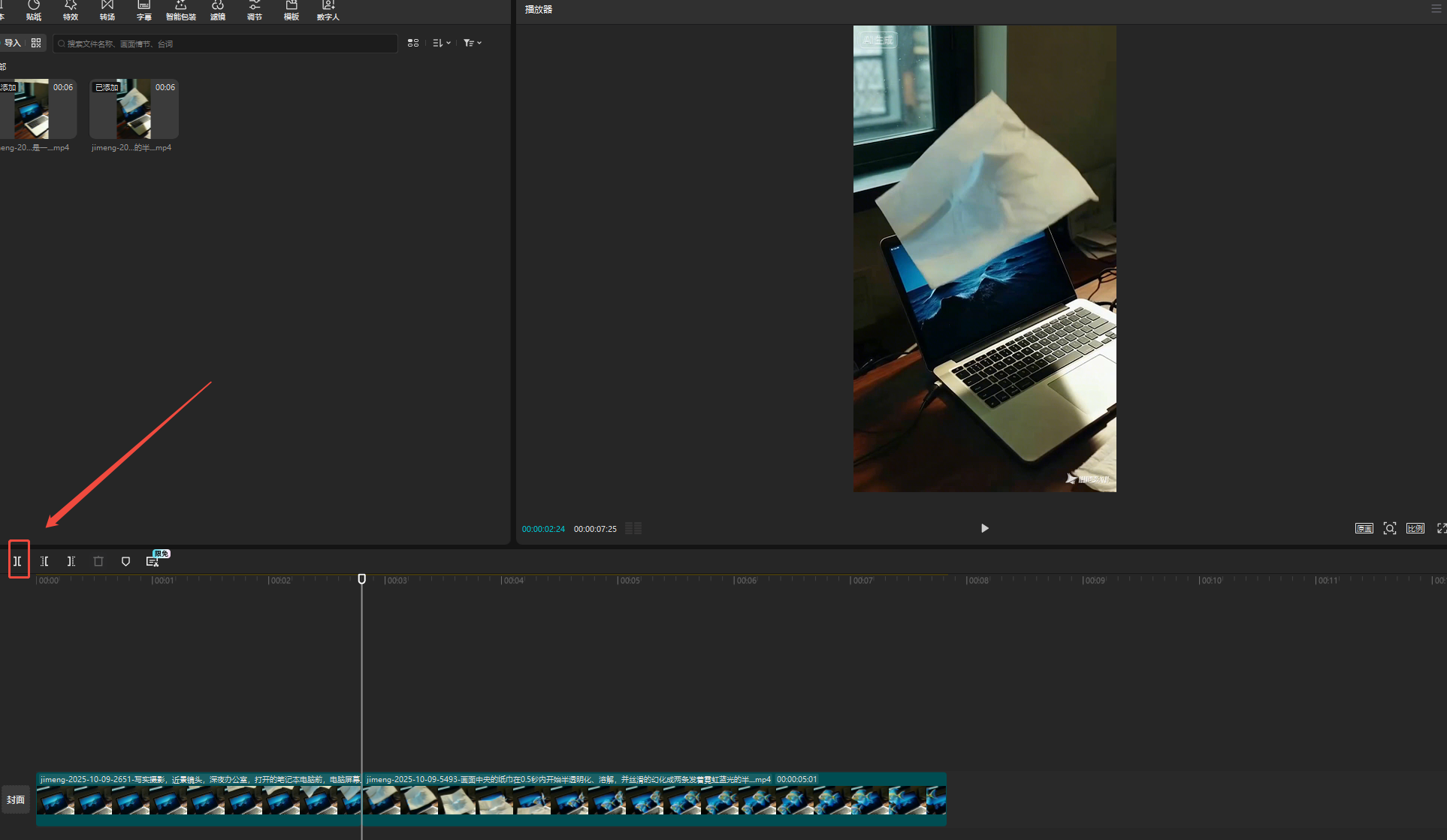 删除纸巾坠落视频中,你截取静帧后多余的部分,将鱼变身的视频接上。