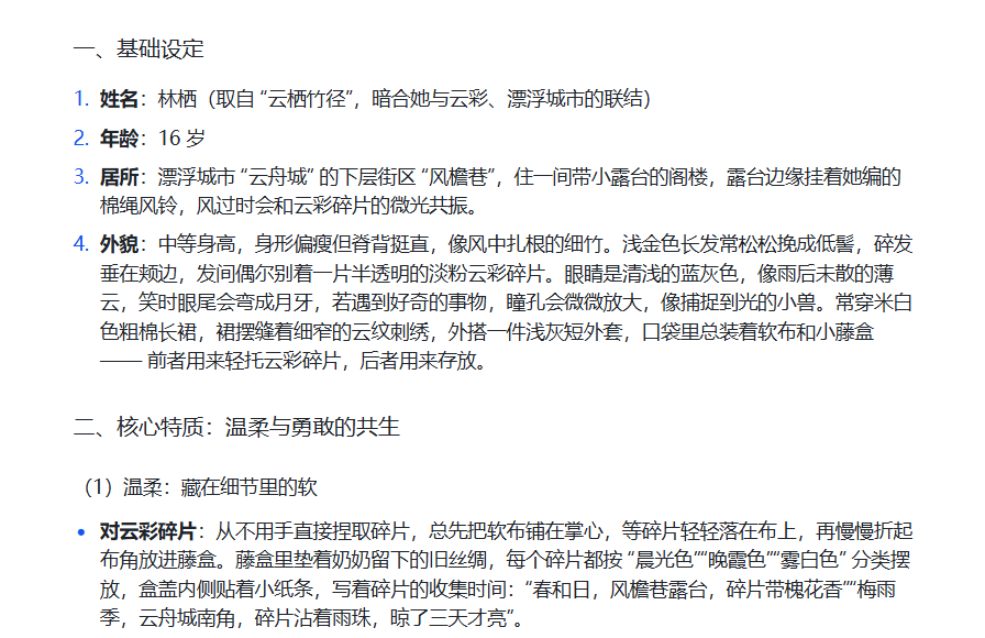 “请帮我设定一个温柔而勇敢的少女角色,她生活在一个漂浮的城市里,喜欢收集云彩碎片,对下面的世界充满好奇。”豆包会帮你生成人物的背景、性格、外貌乃至语气。