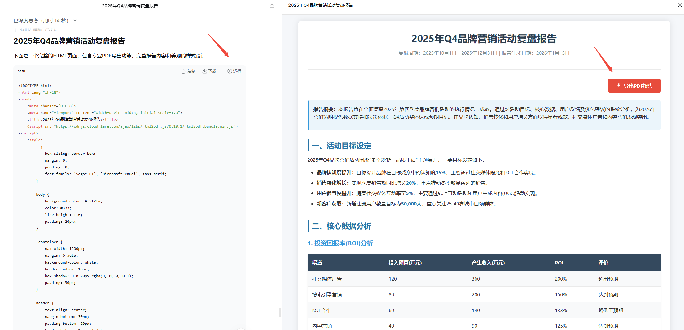 “请基于我刚才生成的《2025 年 Q4 品牌营销活动复盘》,将其内容完整且清晰地以 HTML 代码格式重新输出。要求标题居中加粗,表格宽度 100% 充满页面,并确保所有内容完整性。请在页面顶部添加一个专业的、可直接下载 PDF 文件的功能按钮。 ”