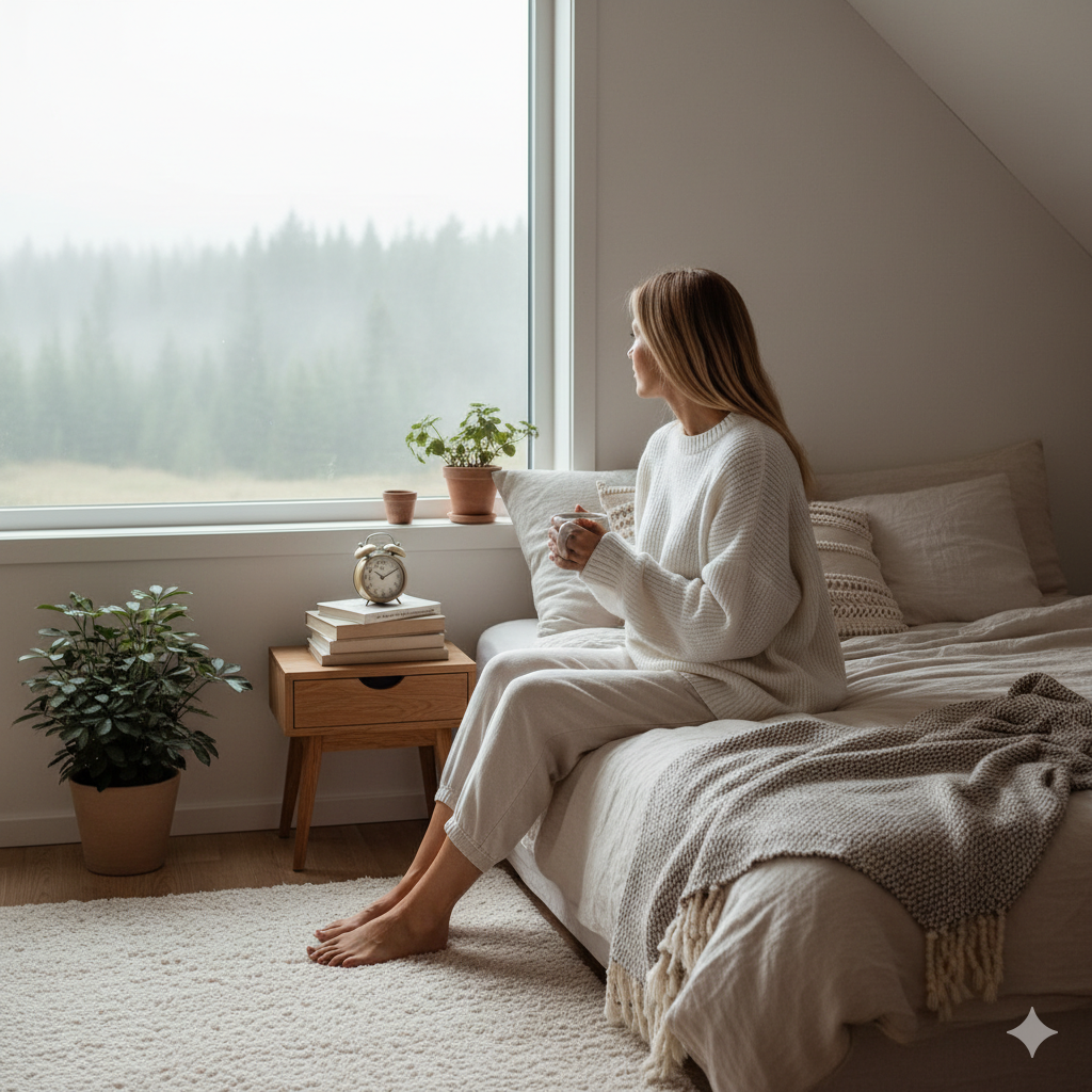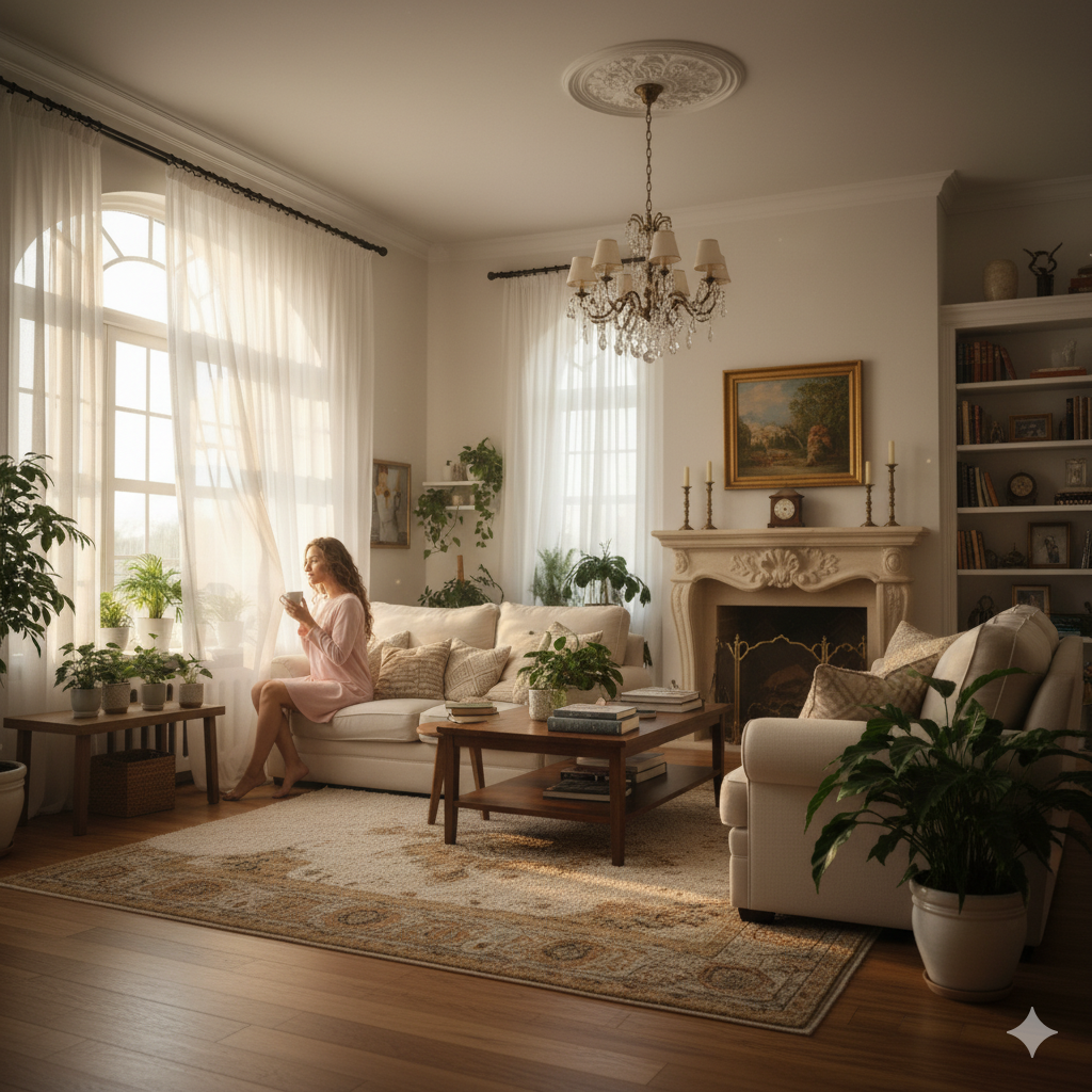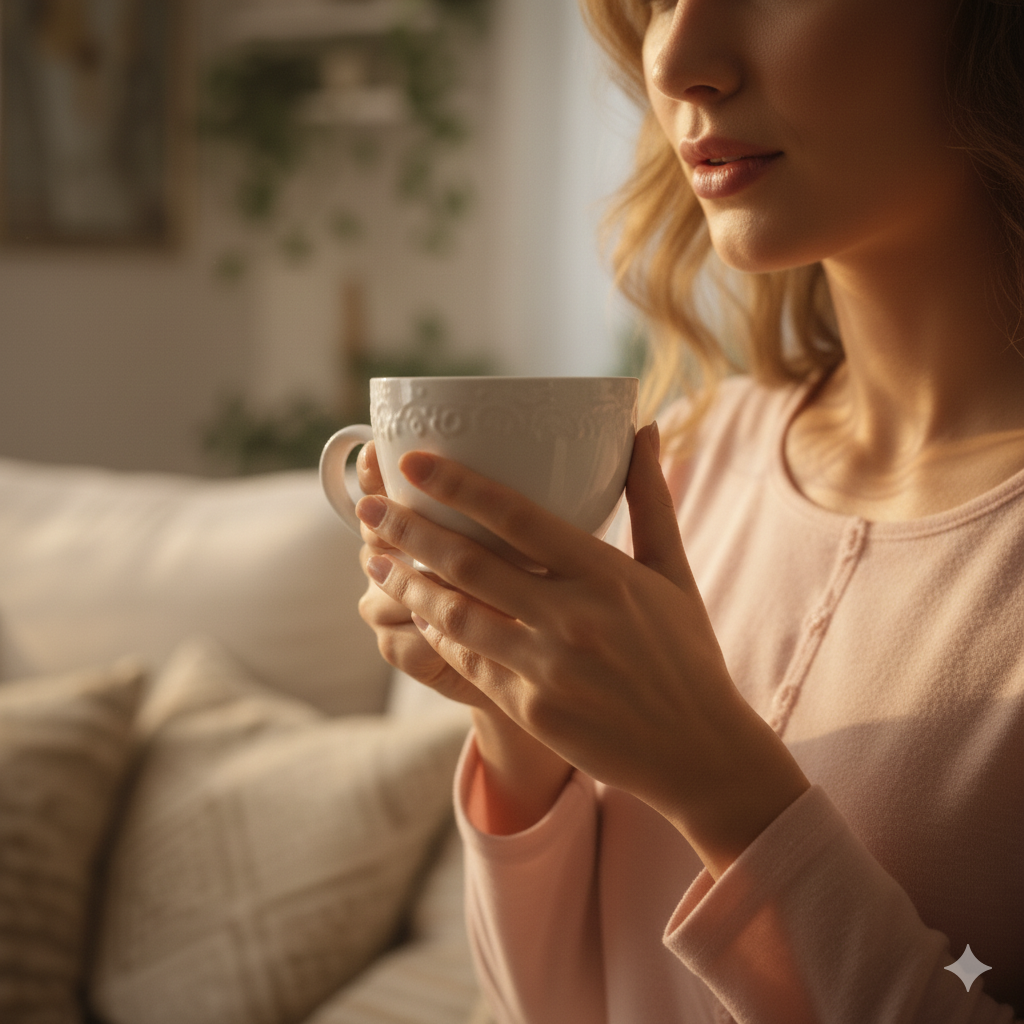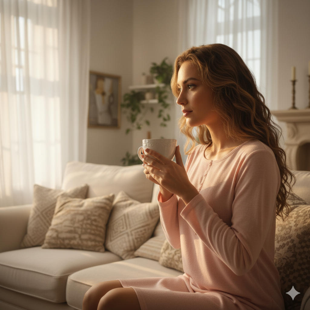 一位二十多岁的女子,长发微卷,身穿浅粉家居裙,正坐在窗边喝咖啡,阳光透过窗帘洒在她的侧脸上,房间温馨、布艺沙发、绿植装饰。