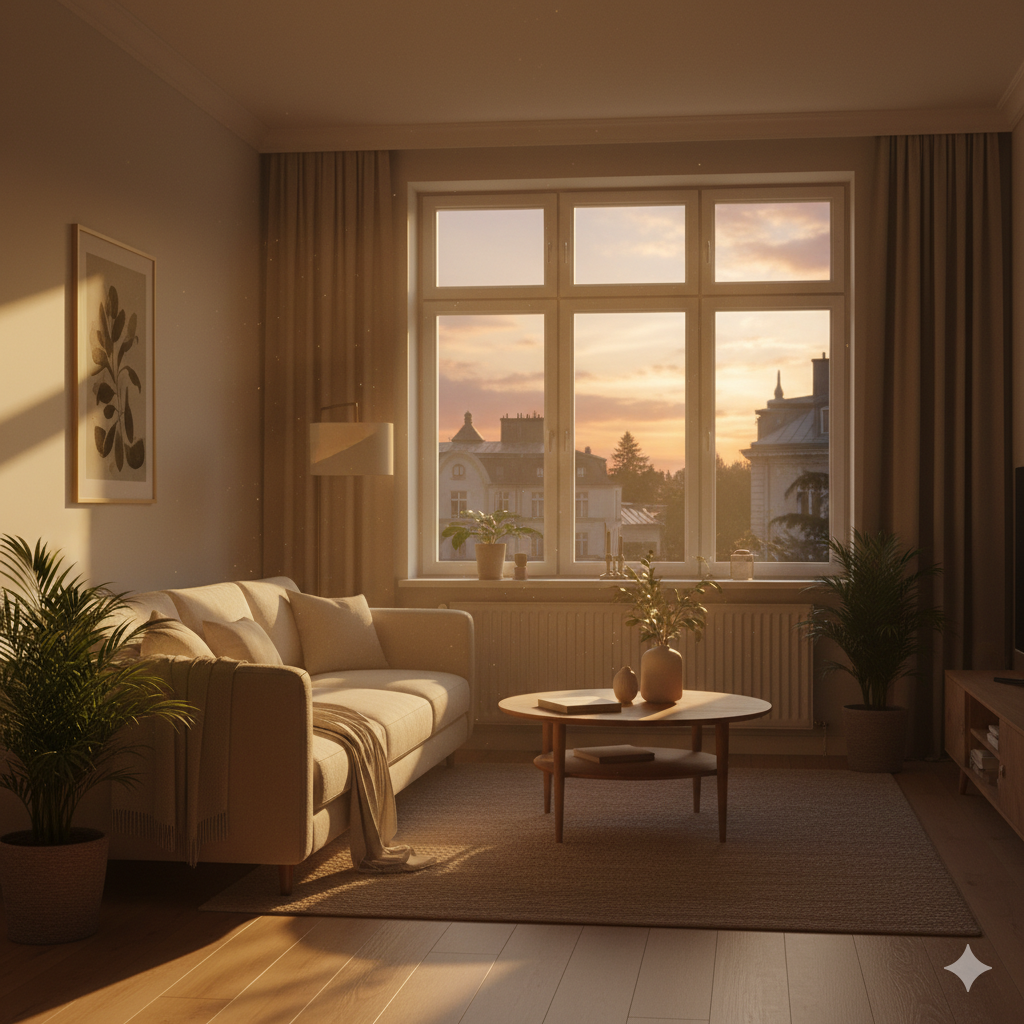 傍晚时分,金色夕阳透过窗户洒进来,形成柔和暖光,整个画面色调偏金黄,温暖、宁静。