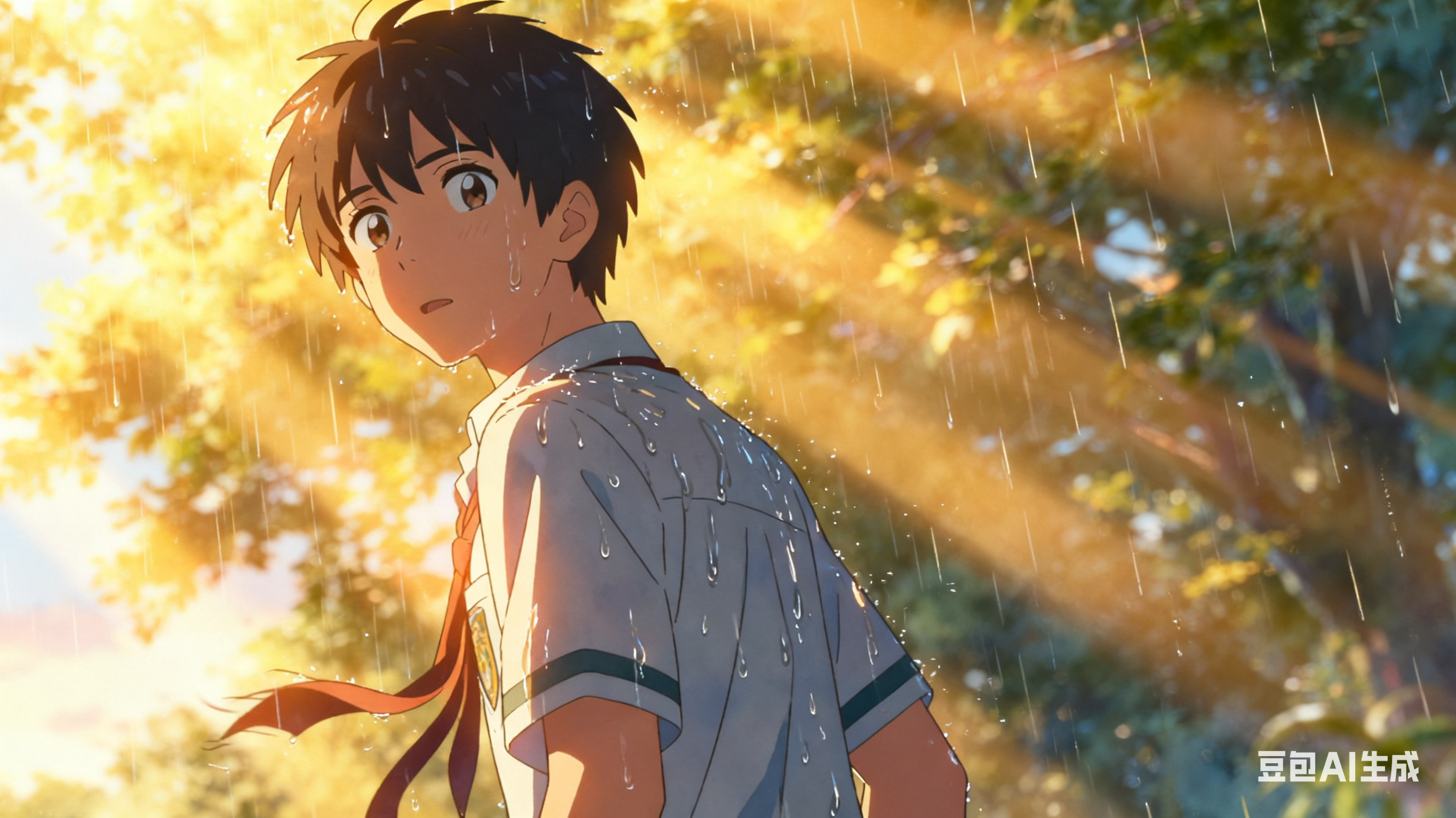 当你学会了这三部,下次写提示词就会是这样的:一位穿着湿透校服的少年,他的侧脸被温暖的夕阳光束击中。 少年微微侧头,眼神充满对夏日雨天的温柔好奇。 强调风吹动他衣角和头发的细腻动态。