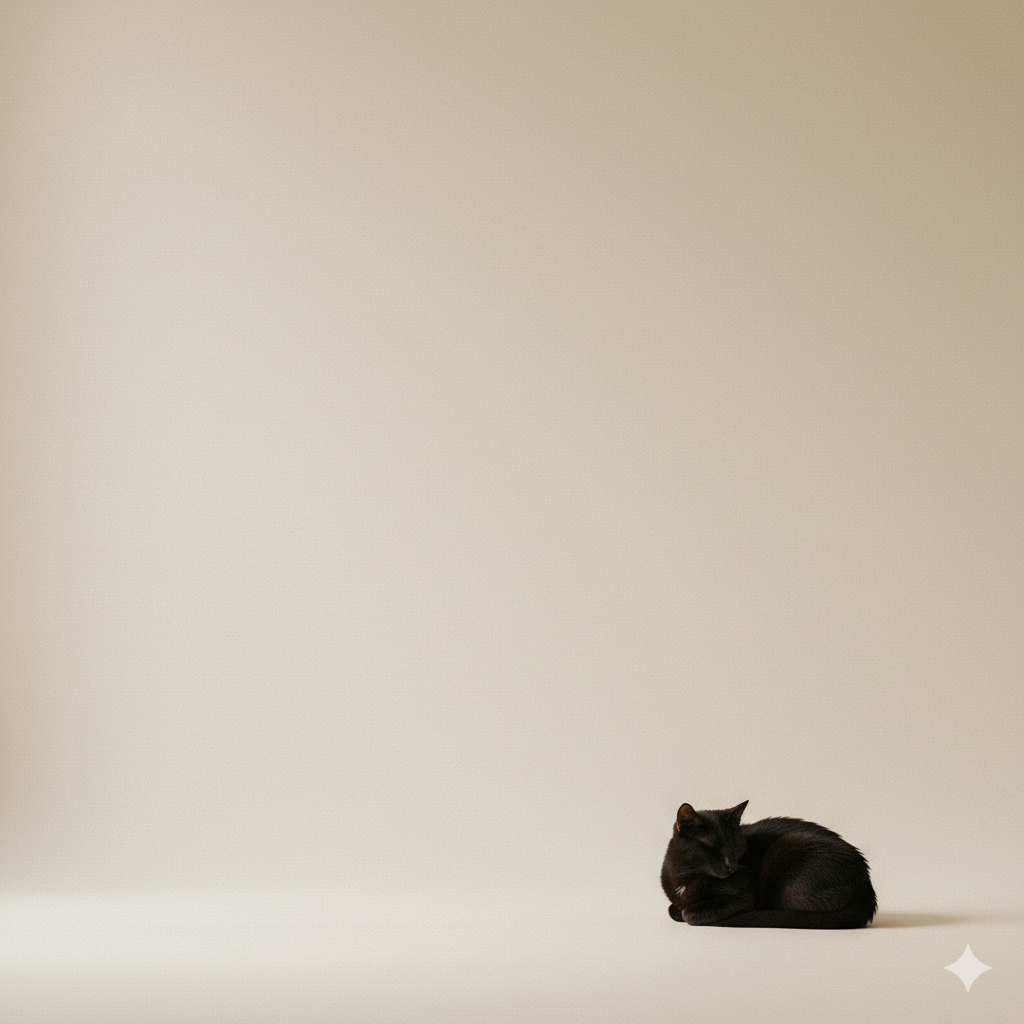 一幅极简主义画面,一只黑猫位于画面右下角三分之一处。背景是一个广阔、无尽的,充满微妙颗粒感的浅米色画布,形成压倒性的负空间。光线为柔和的窗口散射光,只留下物体底部一丝若隐若现的阴影。16:9 比例,适合 PPT 封面。