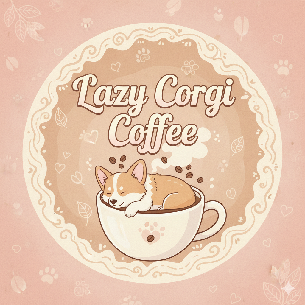 为一家高咖啡店创建一个海报,文字“Lazy corgi Coffee”使用奶油手写体,浅粉与奶白渐变色调,风格温柔可爱。