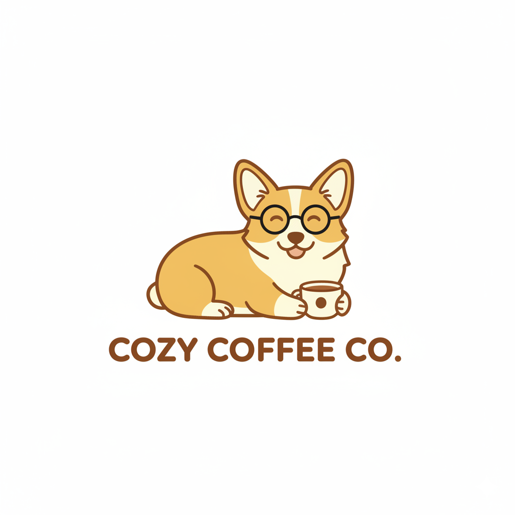 一个极简主义风格的 [产品 LOGO] 贴纸,主角是一只正在喝咖啡的慵懒柯基犬,圆润的身体轮廓和一副黑色细框眼镜。使用高饱和度的奶油黄和焦糖棕色彩搭配。清晰的粗描边线条和柔和的平涂阴影风格。背景保持白色。