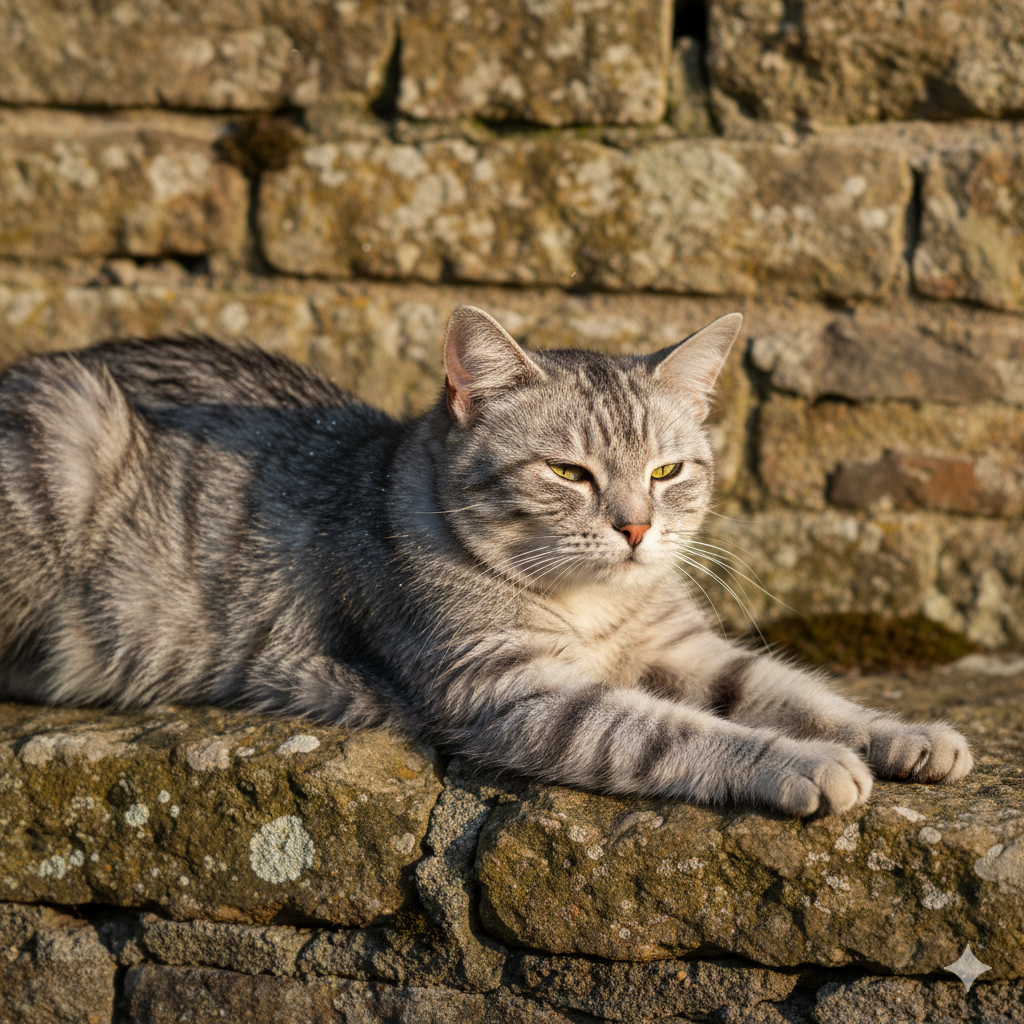 一张照片级真实感的街拍,全身银灰狸花猫在阳光下伸懒腰,背景是一堵老石墙,光线柔和温暖,带点下午茶的慵懒感。使用哈苏 H6D 相机和 80mm 定焦镜头拍摄,强调湿漉漉的皮毛纹理和瞳孔内虹膜的细节。图像应为16:9 宽屏电影格式。