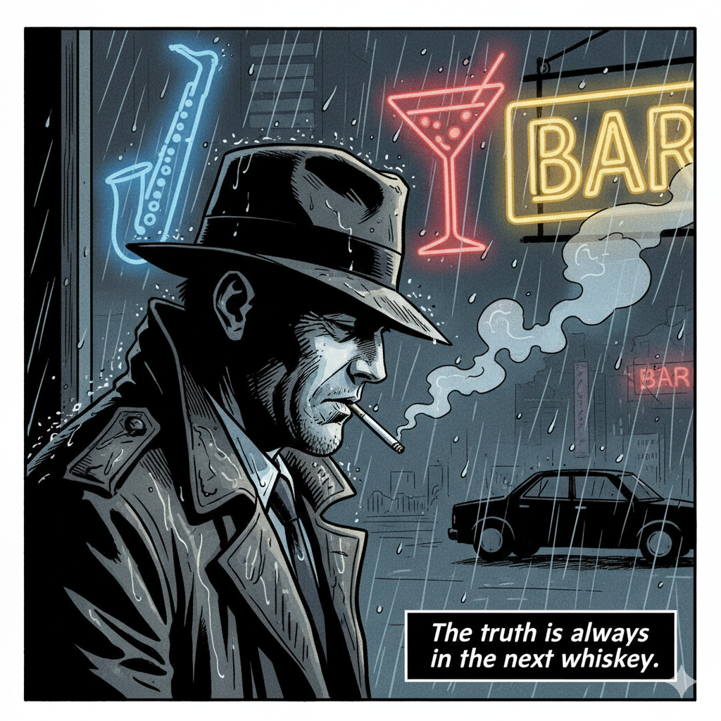 一个美式黑色电影风格的单格漫画分镜。前景中,一个穿着湿透风衣、带着爵士帽的侦探,疲惫地抽着烟。背景中,一扇被雨水冲刷的霓虹灯窗户,窗外是阴森的街道。分镜下方有一个黑色旁白框,文字为“The truth is always in the next whiskey”高对比度的硬光照亮侦探的侧脸,营造出绝望而宿命的氛围。