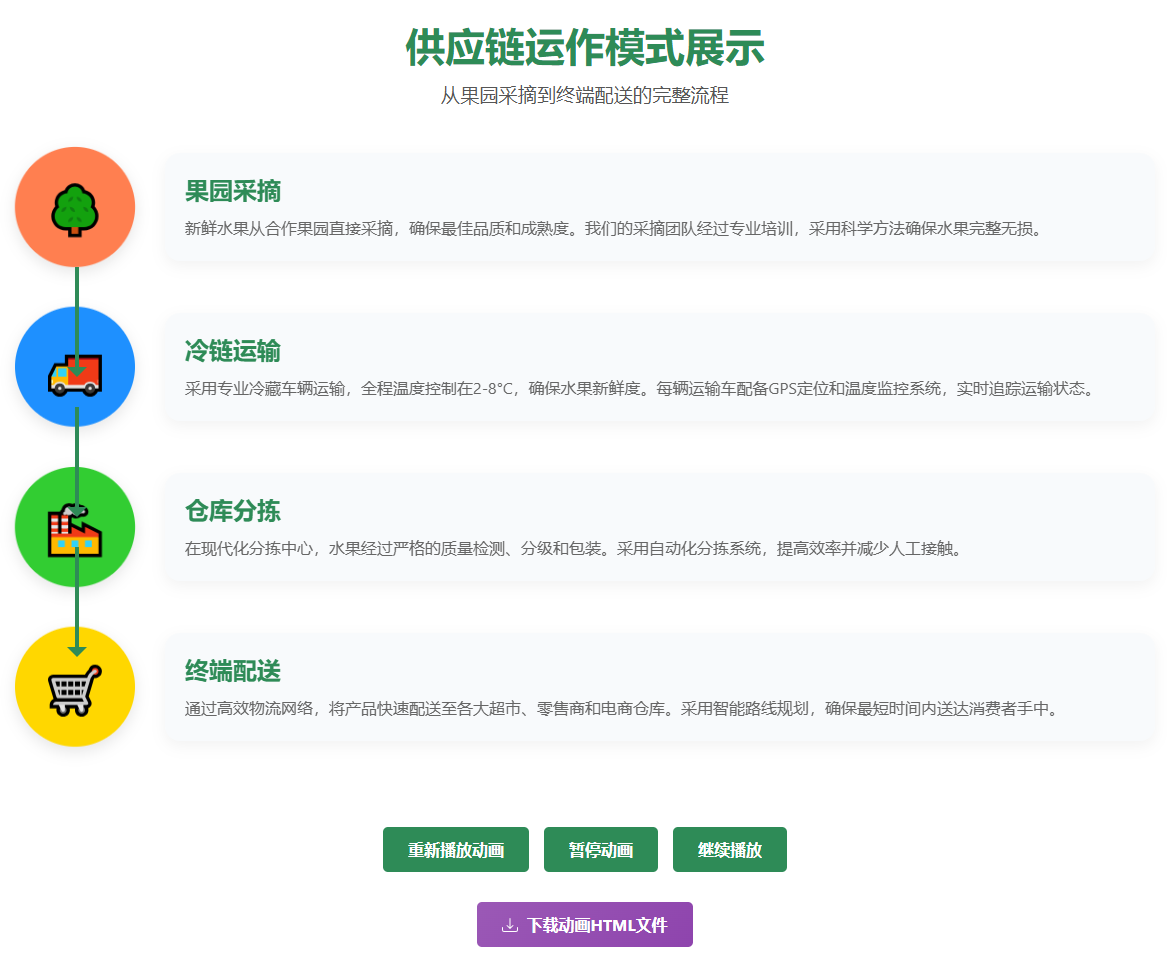 很多人卡在第一步——不知道怎么“说清需求”。其实就像跟朋友聊天:“我需要展示产品从果园采摘→冷链运输→仓库分拣→终端配送的完整流程,每个环节要配图加动态箭头,最后还要有数据统计看板!”DeepSeek听到这种“人话”,立刻能给你生成精准的提示词,比如“生成水果供应链HTML动画,包含四个环节,每个环节配实景图片+动态箭头指示流向,结尾加销量数据可视化图表”。