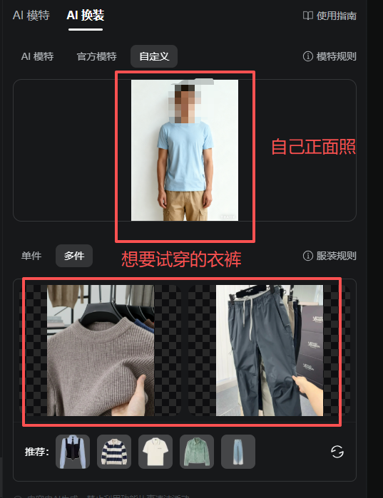 2️⃣ 上传你的全身照(最好穿单色衣服,方便AI识别),再上传你想要的衣服或裤子的图片——比如看中的连衣裙、牛仔裤,直接拖进框里就行!👗