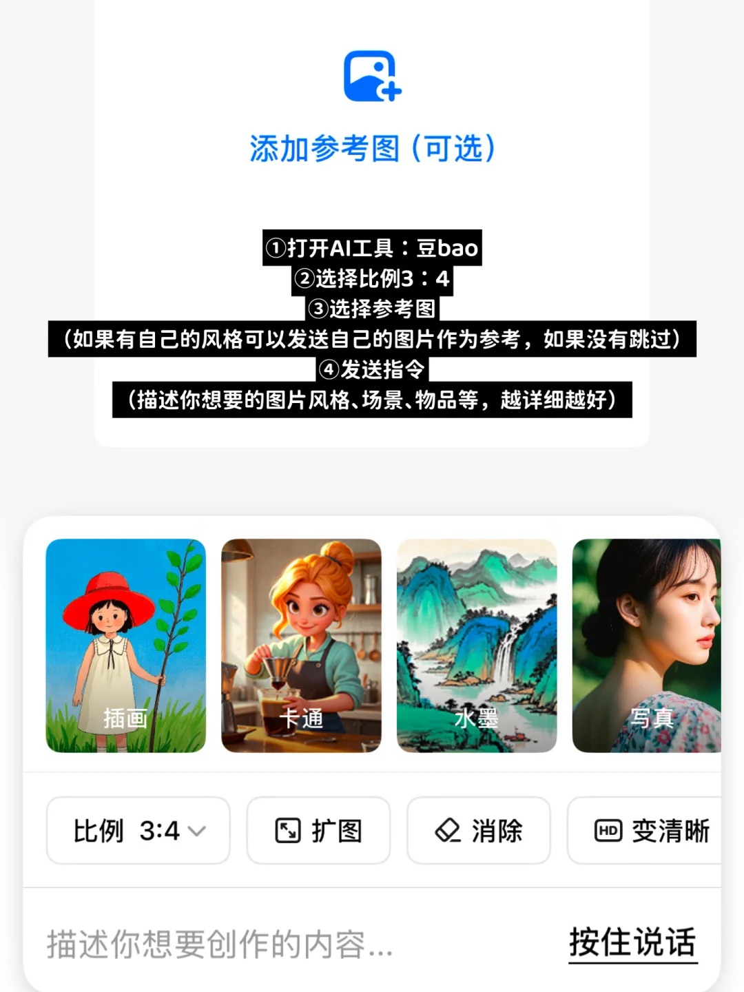 (不知道如何描述可以先发送一张图,让AI给出描述词,再参考调整)