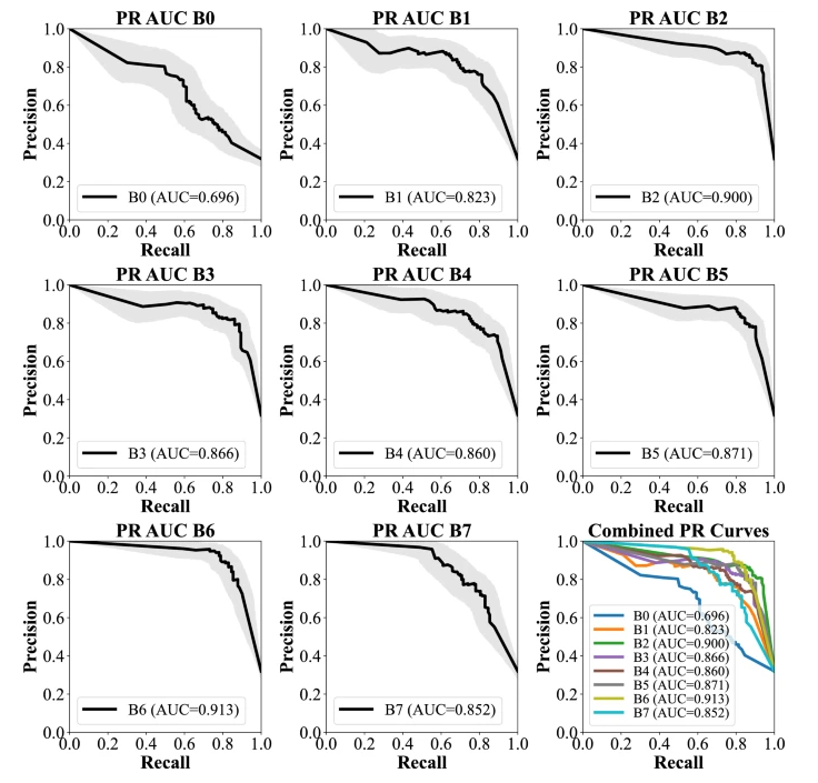 最优模型EfficientNet-B6取得了F1分数0.841、PR-AUC 0.913的表现;