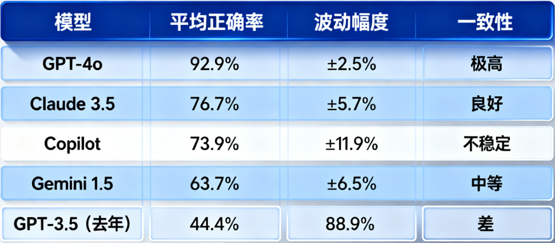 GPT-4o不仅正确率最高,还在三次答题中维持了超90%的稳定性。