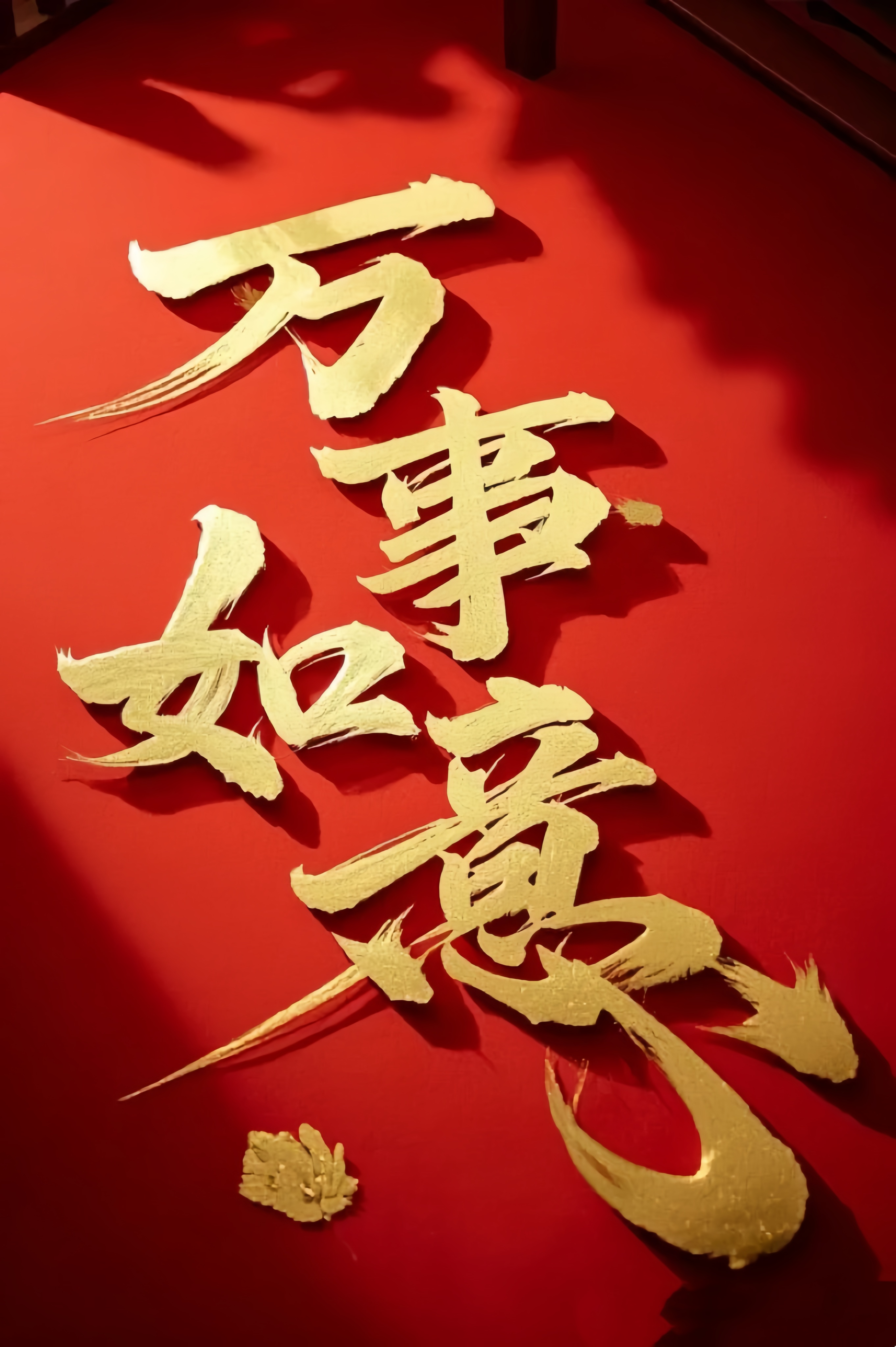提示词:巨大的春联,金色的书法字体,线条流畅,艺术美感,“万事如意”