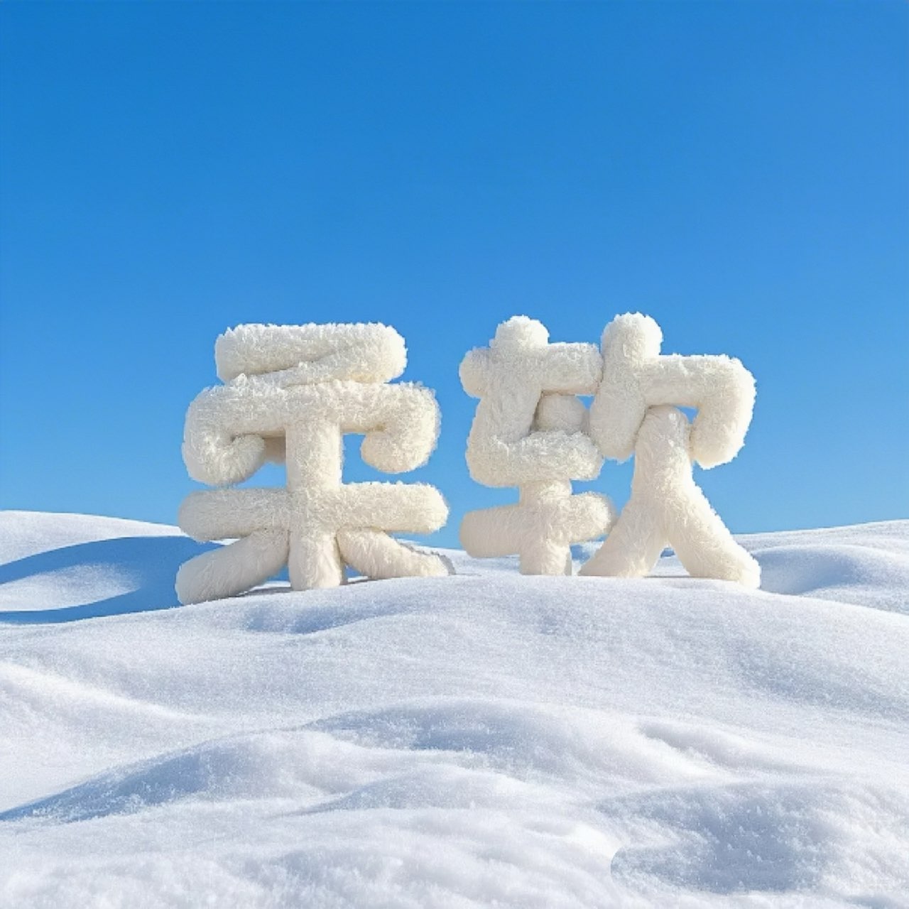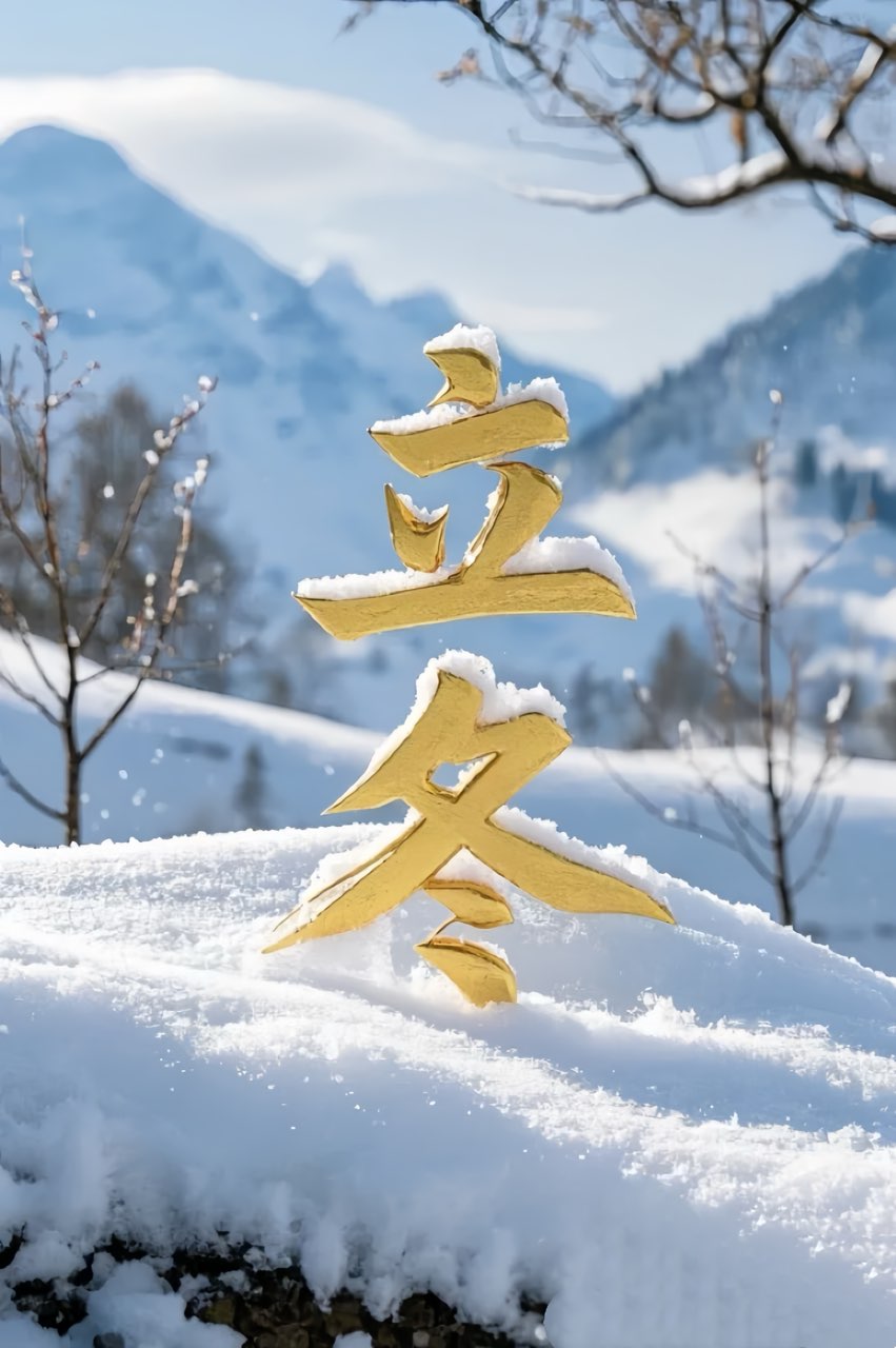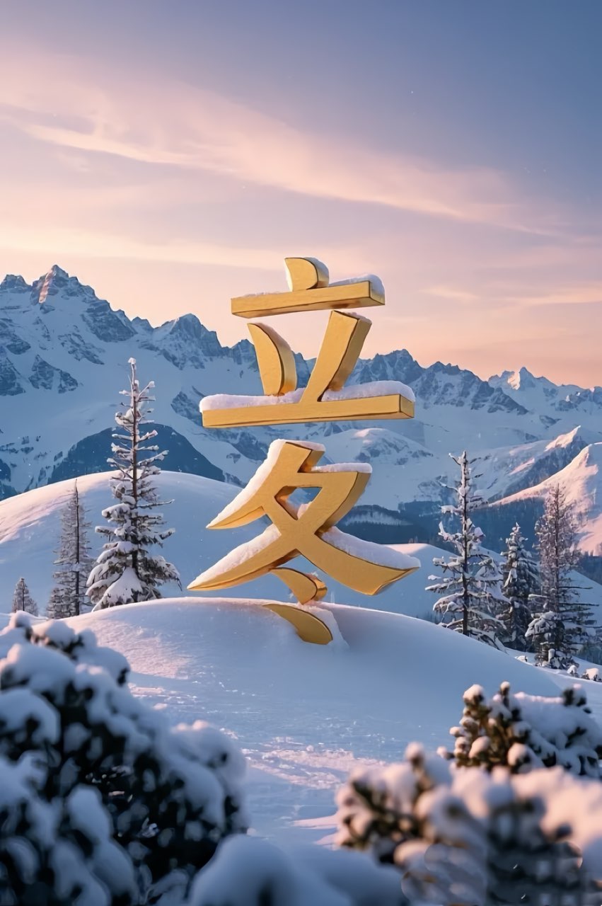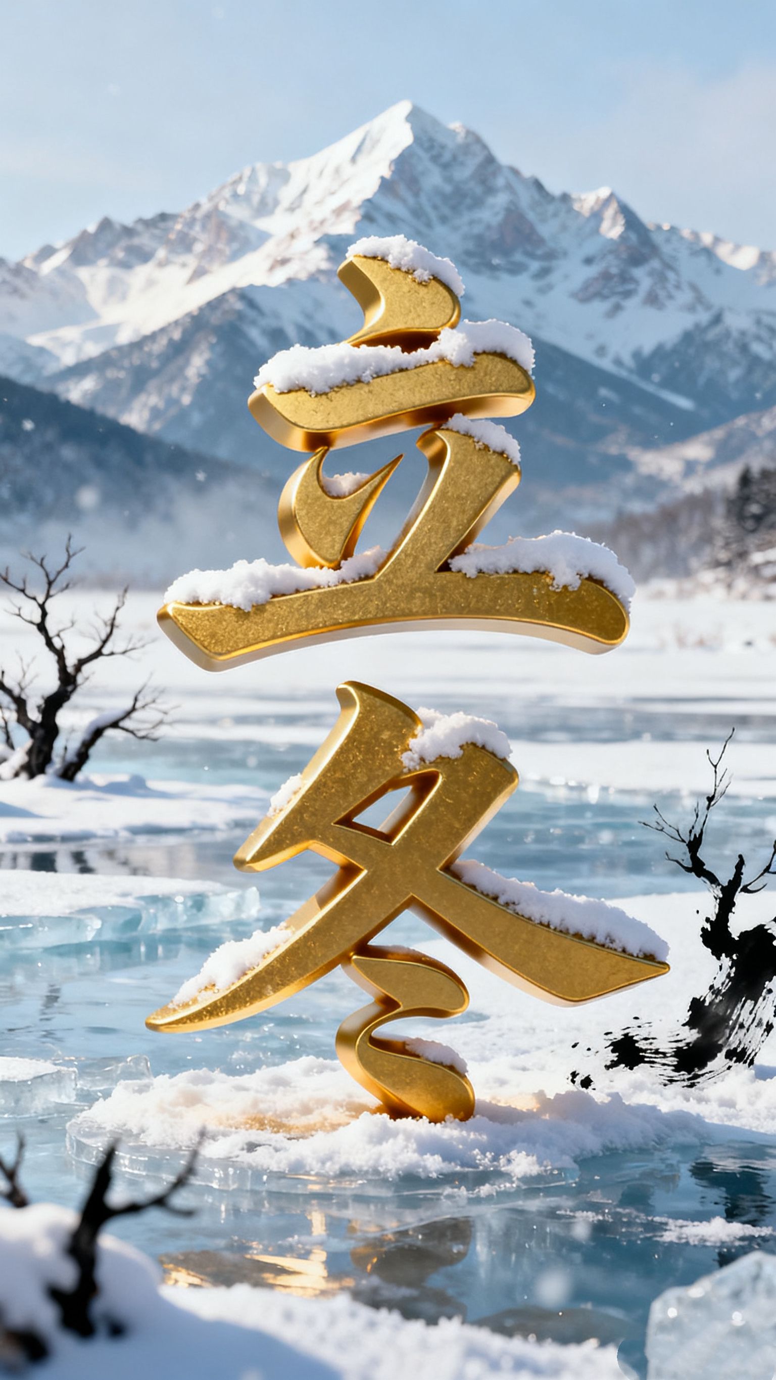提示词:金色立体书法,”立冬“,字体上覆盖着积雪,雪山背景,冬季场景,冰雪覆盖,枯树点缀,柔和光影,梦幻意境,温暖与寒冷对比,静谧氛围,传统文化