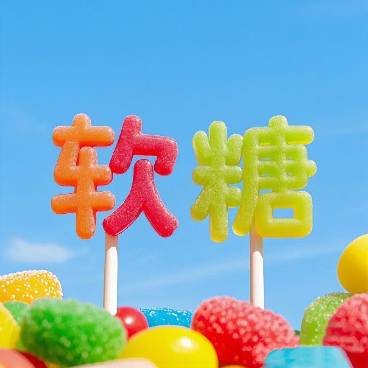提示词:巨大的彩色字体”软糖“,字体使用橡皮软糖材质,周围是五颜六色的果汁糖,背景是蓝天
