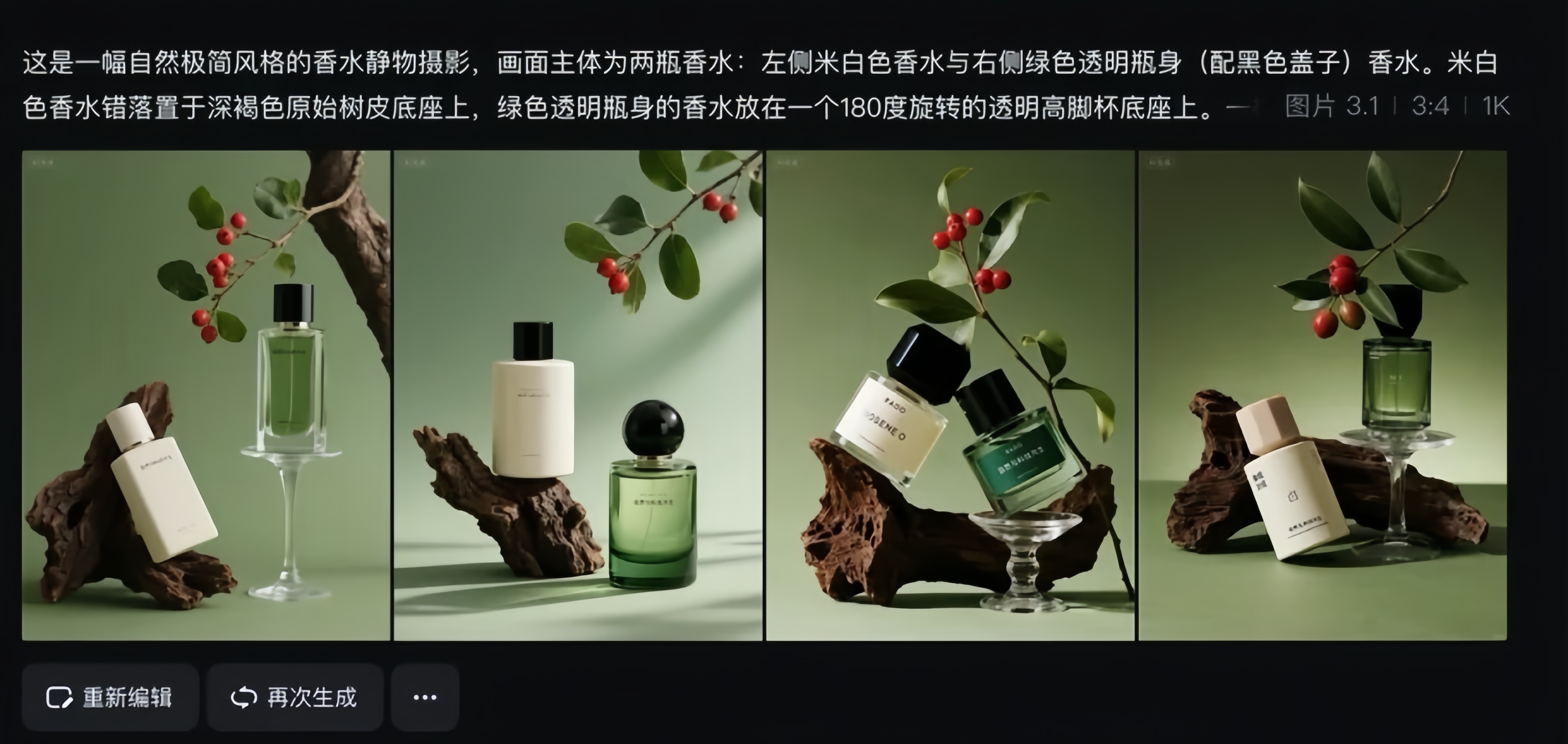 “自然风格静物摄影,主体为护肤品” “北欧极简风香水静物摄影,米白色香水(哑光瓶身)+绿色透明瓶(黑盖),置于深褐树皮底座,右侧红浆果枝条斜伸;背景橄榄绿渐变,构图中心偏下,强化树皮粗糙与瓶身光滑的质感对比,80%留白,光影柔和偏侧光……”