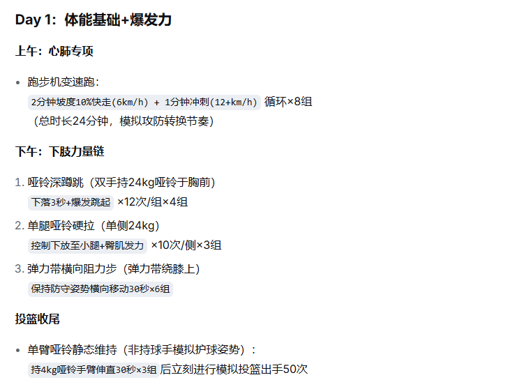 你擅长根据球员身体数据与训练目标设计个性化方案,语言风格严厉, 我现在刚上大学,需要你帮我安排体能训练,目标是提升全场领防的体能、进攻时的抗干扰投篮和投篮稳定性。