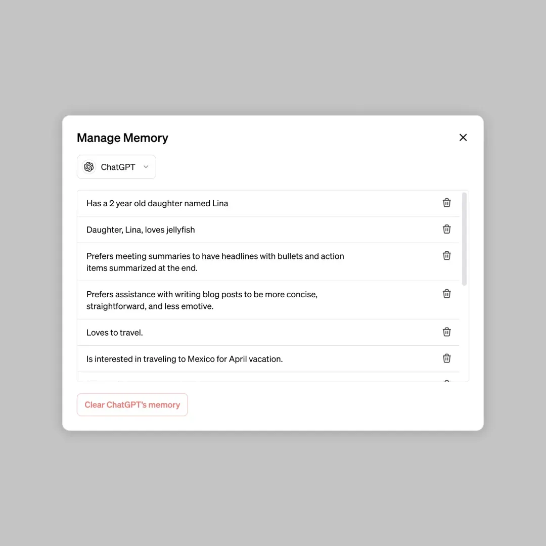 ● 作为这场变革的引领者,OpenAI的ChatGPT早已在去年4月率先推出了记忆功能。