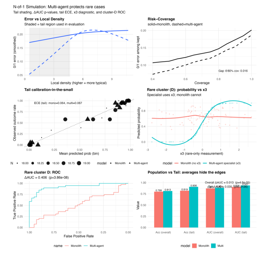 研究团队使用合成数据进行了严苛模拟。结果显示,在常规病例中,多智能体系统仅比传统模型高出1.5%的总体准确率;但在罕见病例中,AUC从0.518跃升至0.924,准确率提升41%。