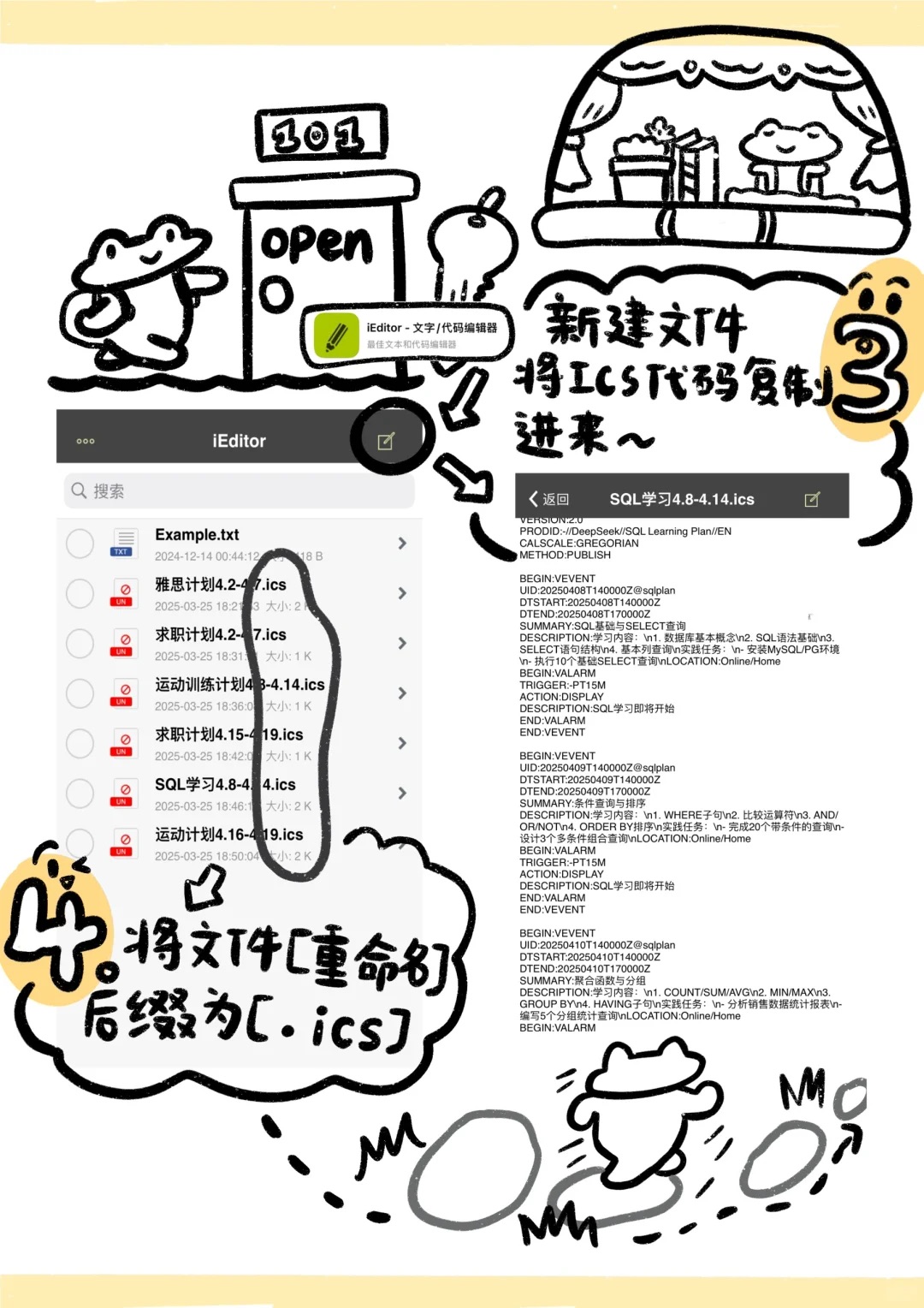 3️⃣ 把代码粘贴到编辑器里,给文件命名,注意后缀必须是「.ICS」