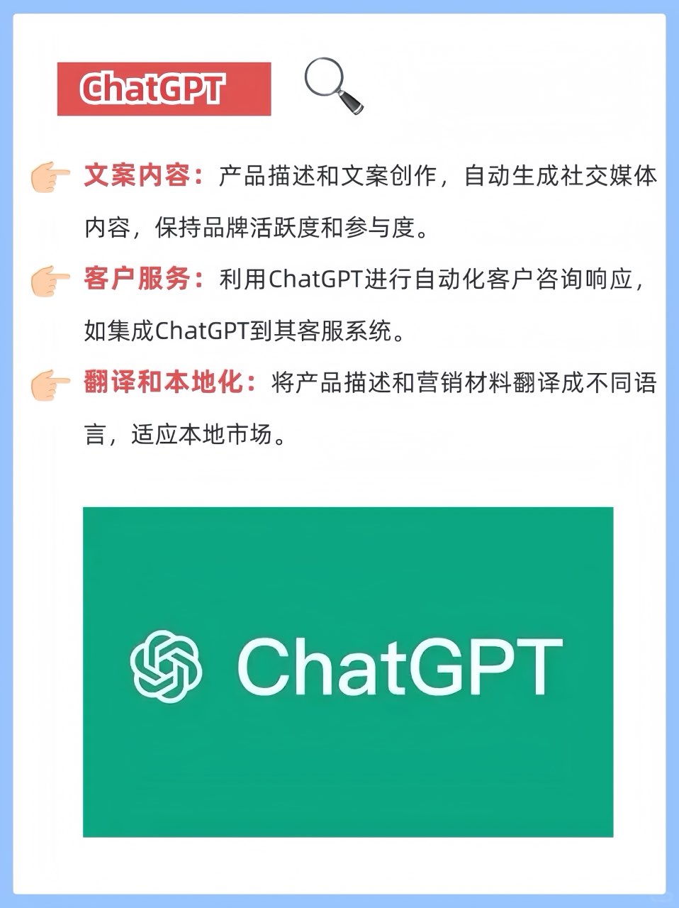 3、 ChatGPT:文案自动生成,客户咨询智能响应,多语言翻译,让沟通无界限。