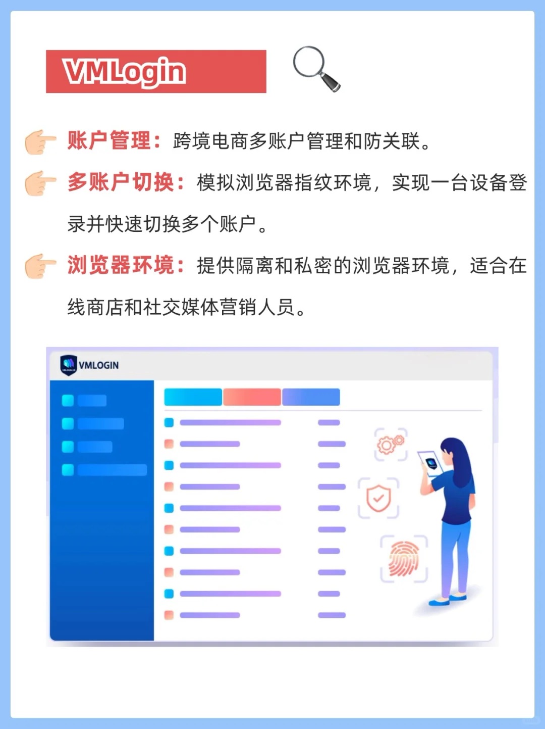 6、 VMLogin:多账户管理,防关联,一台设备轻松切换,账户安全有保障。