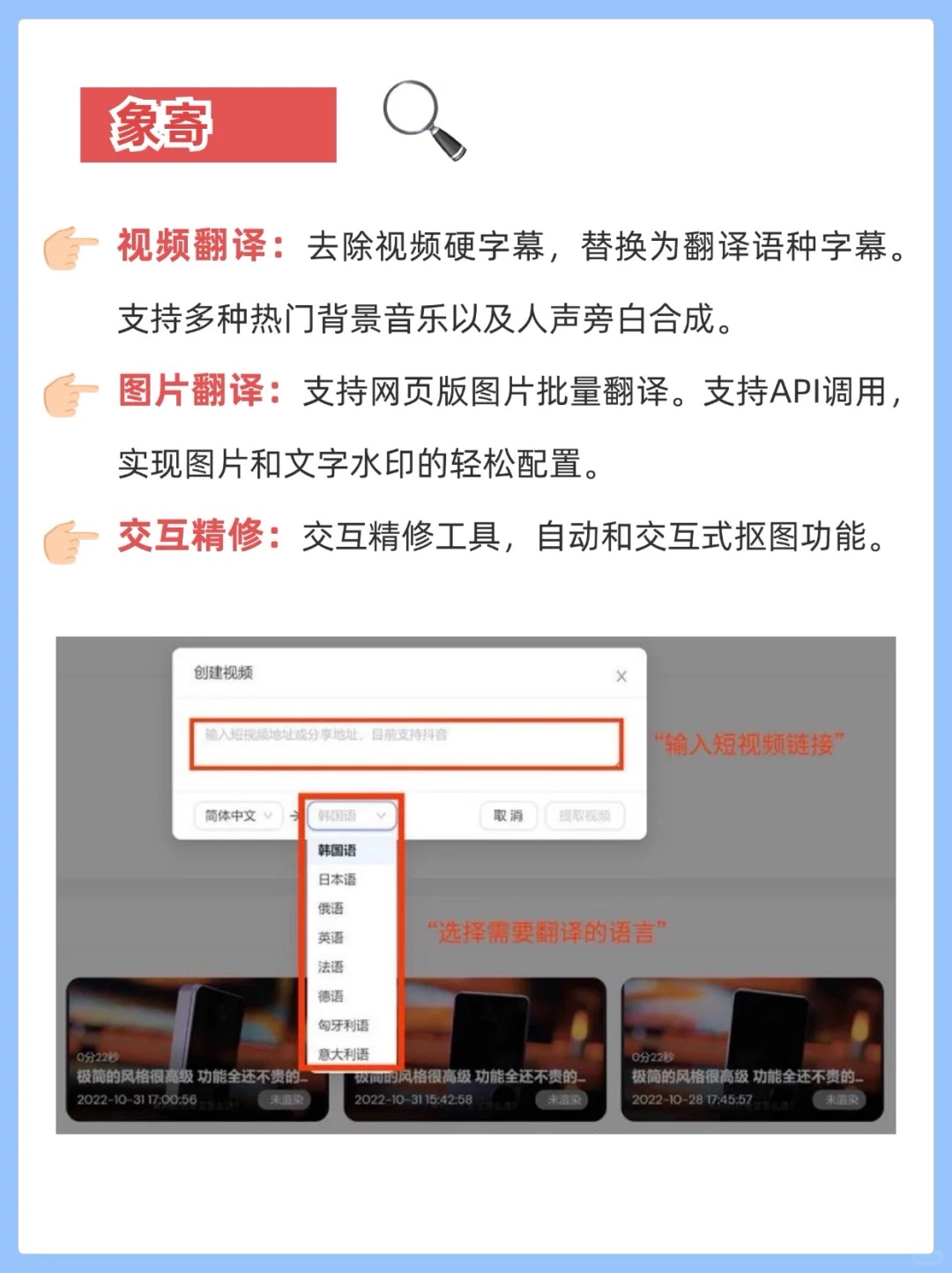 4、 象寄:视频硬字幕一键去除,多语种配音,图片翻译,API调用超便捷。