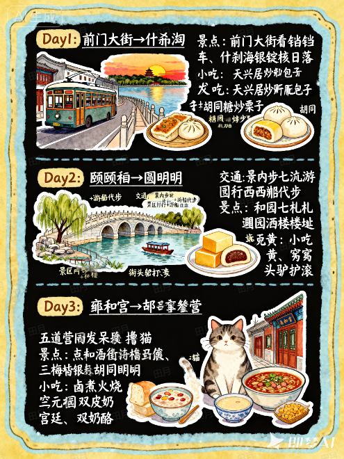 根据3天出游时间,制作一个北京旅行攻略,形式是插画风格的手账图文笔记。