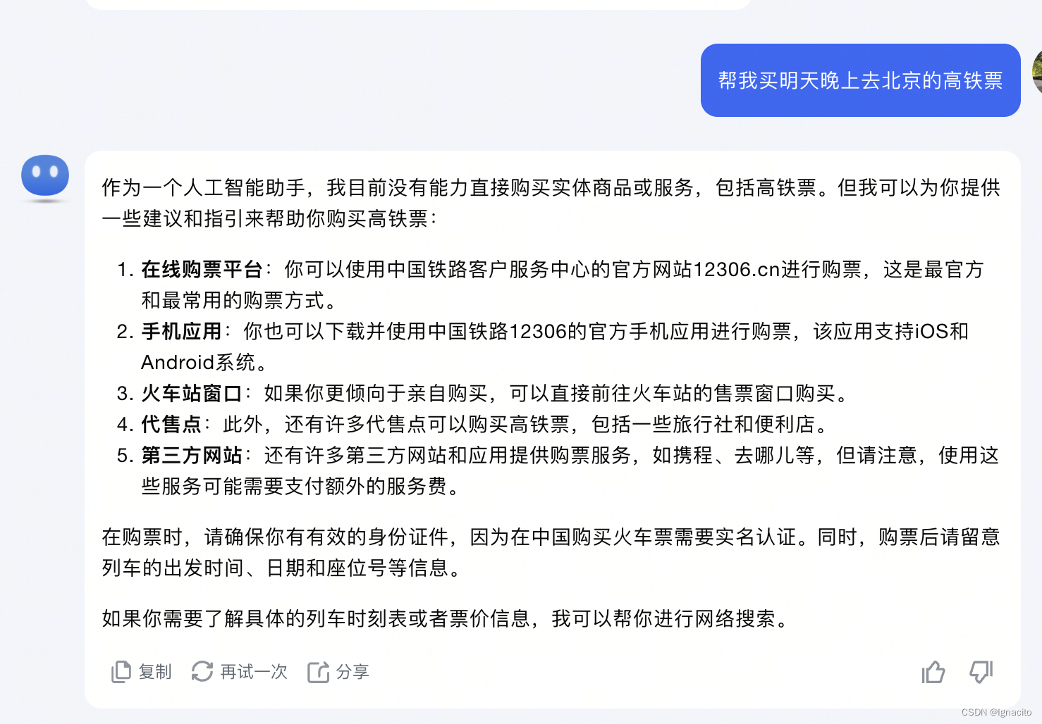 (虽然LLM完全理解了买票的行为,但是它本身并不知道“我”所处的城市,列车的时刻表,价格等等信息)