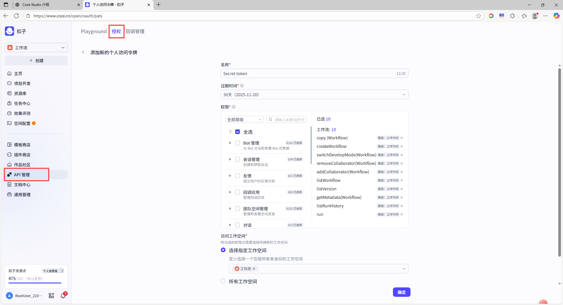 点击左侧“API管理”,找到顶部“授权”,填写名称和过期时间、权限等。