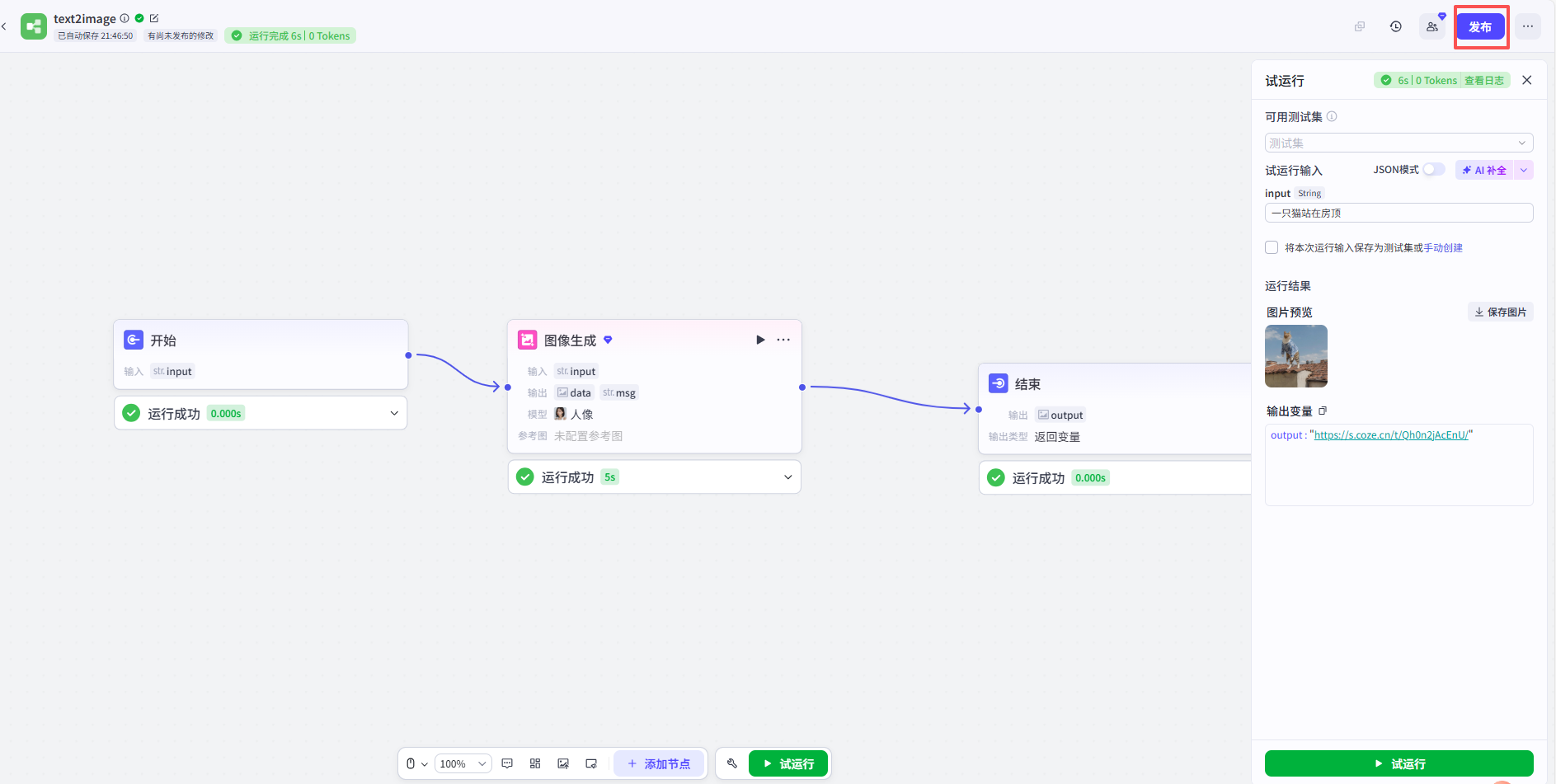 输入令牌token值、工作流id和开始节点需要的输入参数input,填写完毕后,直接点击右上方运行,output就是返回的就是图片地址。