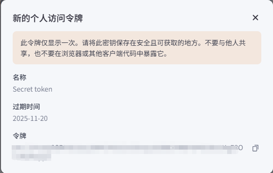 生成的令牌需要注意复制保存下来,关闭了就没有了。