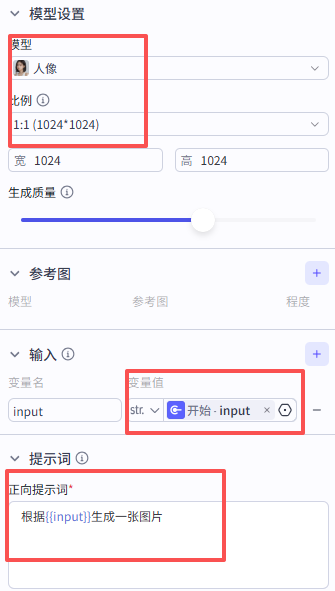设置比例1:1,模型选择“人像”,变量值选择“开始”,填充提示词,参考如下: