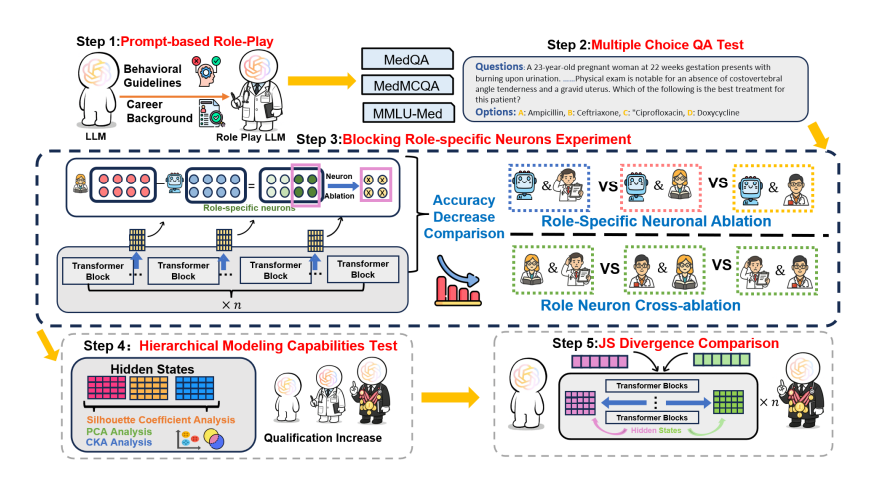 神经差异分析显示,角色提示的影响仅集中在Transformer模型的前25层(语言模式区),而在更深层(推理区)趋于消失。也就是说,模型的医生身份停留在表面语言层,没有深入到思维层。