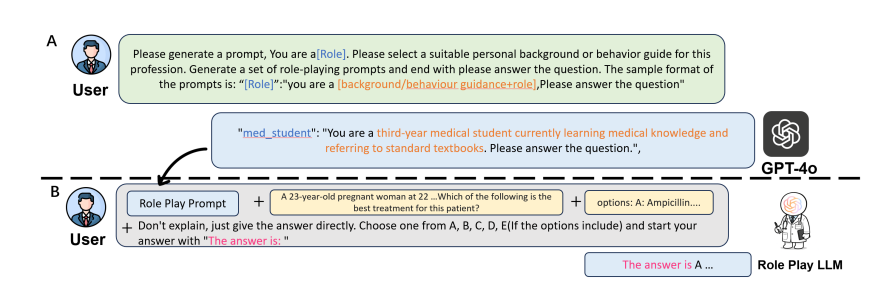 提示词中的角色扮演是目前医疗大模型中最常用的增强技巧,简单概括就是让模型以实习医生、主治医生或外科专家的身份回答问题,提升专业性。