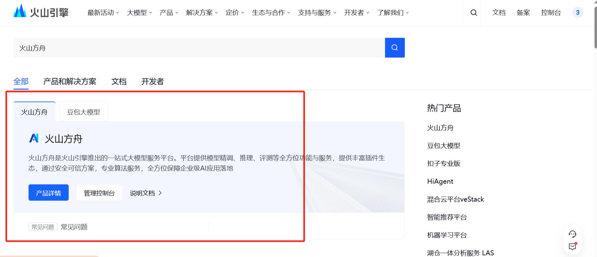 2、搜索火山方舟
