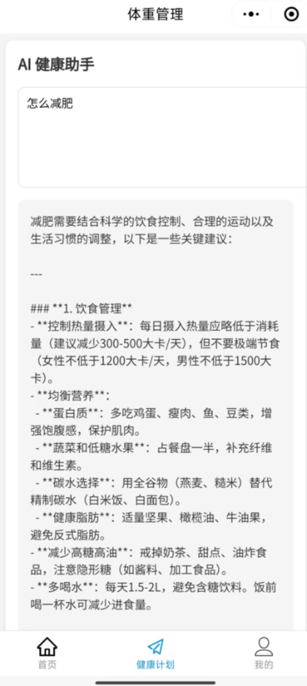 我要做一个微信小程序,小程序是一个体重管理小程序,可以通过 BMI 判断一个人的健康状况,并且给出合理的健康计划用于控制体重。