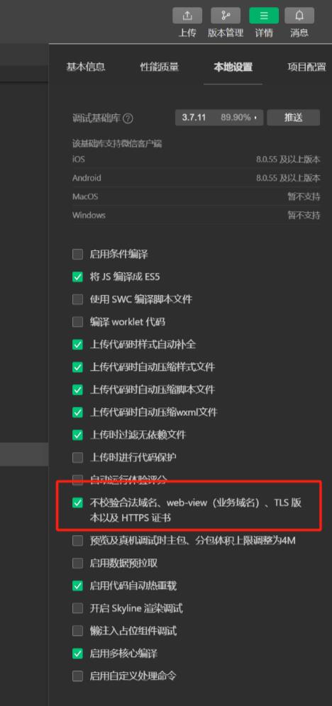 点击开发者工具右上角的详情,勾选本地设置中的不校验合法域名、web-view(业务域名)、TLS 版本以及 HTTPS 证书。