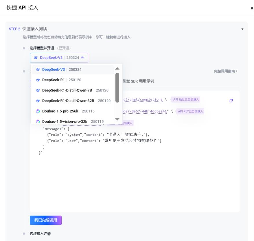 4、选择你想接入的大模型点击我已完成调试