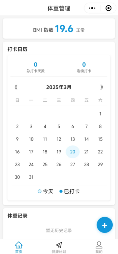 2)第一个导航页面为首页,包含 BMI 展示、打卡日历和体重记录;