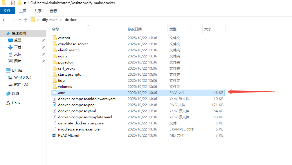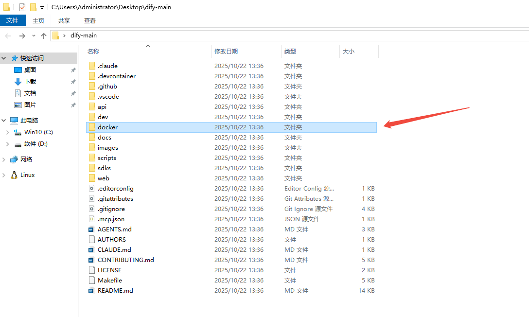 解压后,你会看到一个叫 dify-main 的文件夹,我们主要用到的是 docker 文件夹。