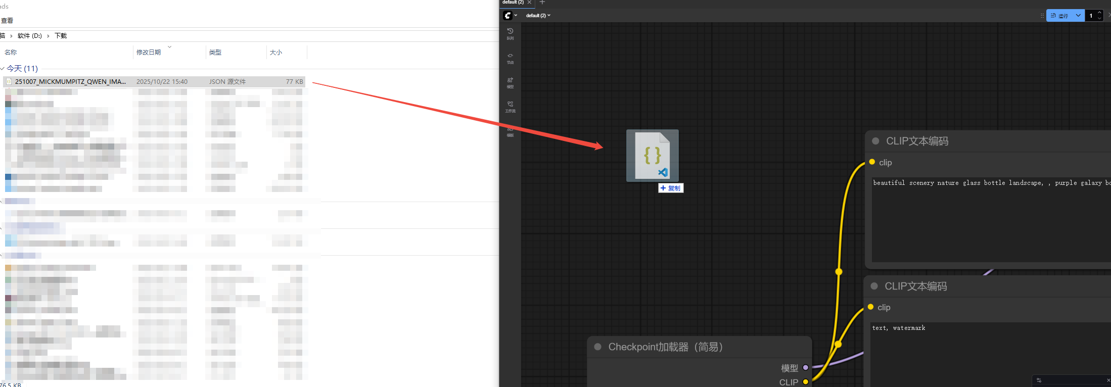你只需将大神分享的 .json 工作流文件直接拖拽到 ComfyUI 的浏览器界面中,工作流就会自动加载。