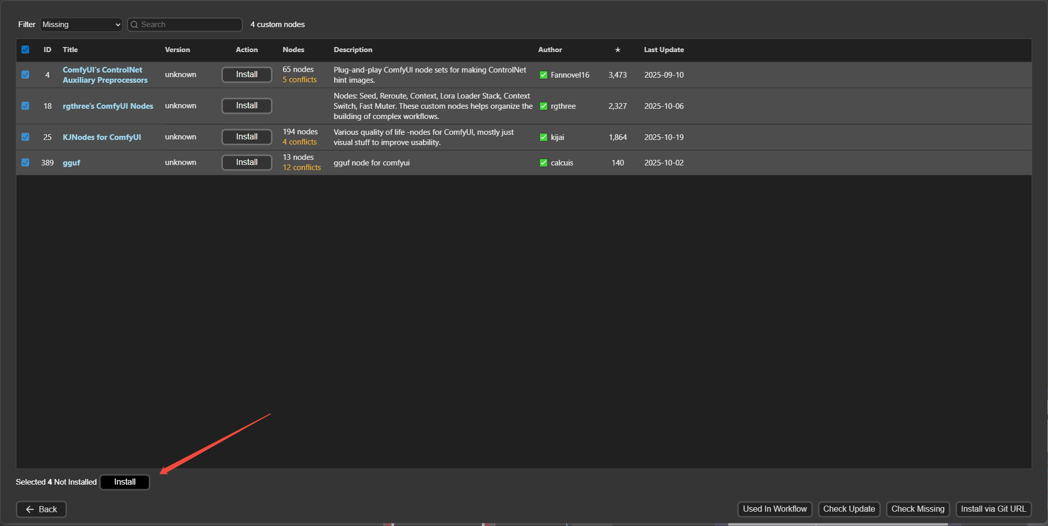 管理器会列出所有缺失的节点,你只需全选后一键安装即可。