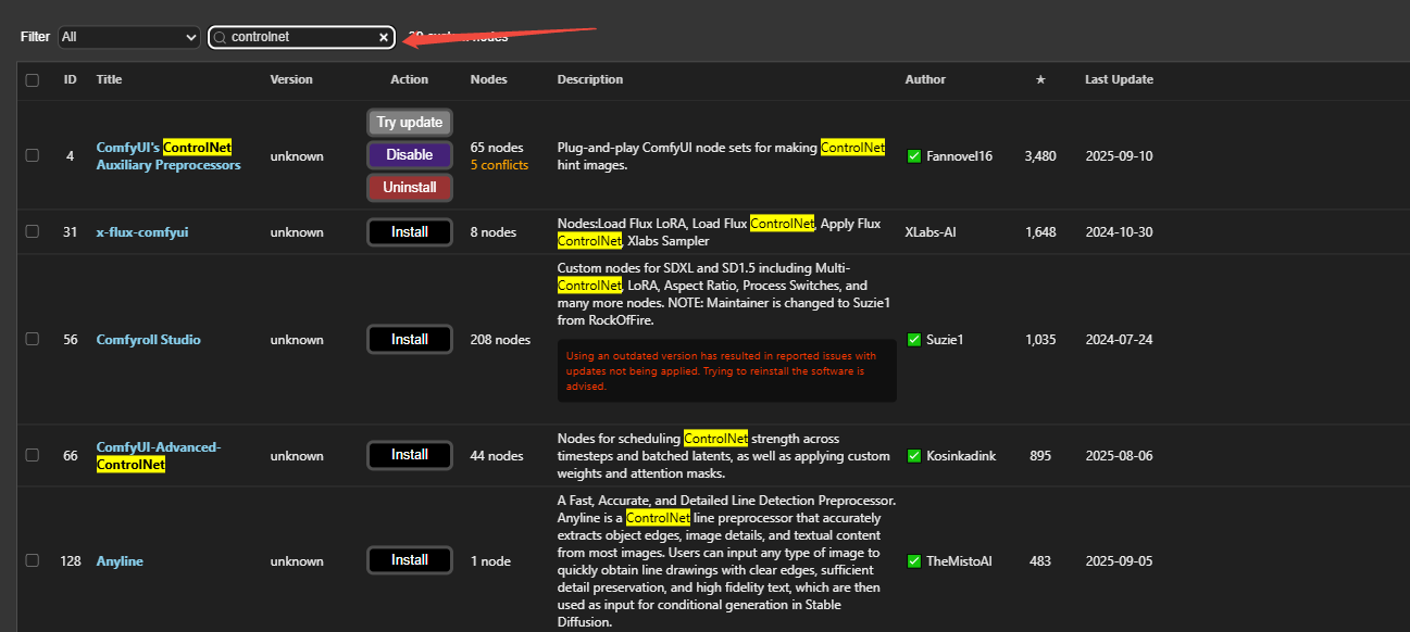 在搜索框输入你想安装的插件名称,比如 “controlnet” 。