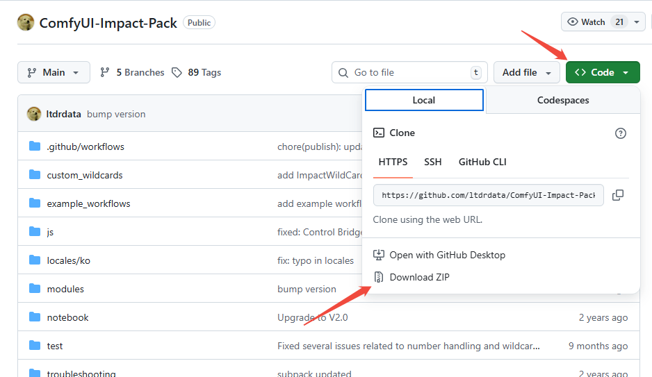 到插件的 GitHub 页面,点击 Code → 复制 HTTPS 链接,例如:https://github.com/ltdrdata/ComfyUI-Impact-Pack.git