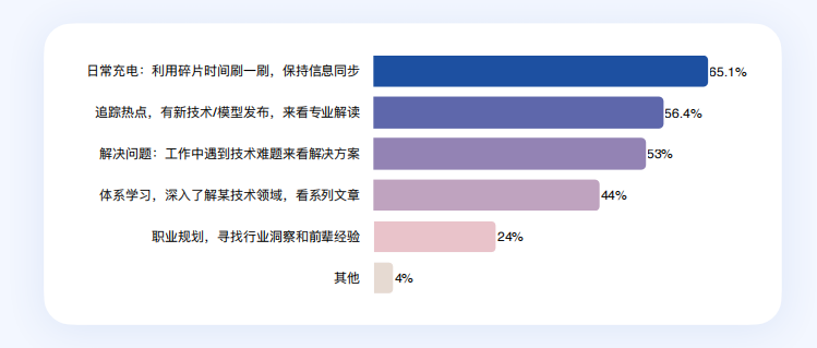 这种焦虑的错位很有启发意义。它表明开发者们已经超越了生存恐惧,进入了更高的价值追求阶段。驱动他们的首要动机不再是“较高的收入”(仅占25.62%),而是对前沿技术的“热情”(63.55%)和抓住“时代机遇”的渴望(59.11%)。
