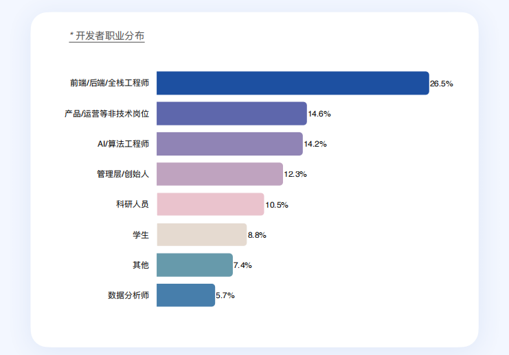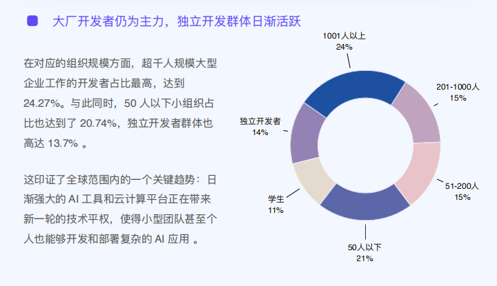 白皮书显示,参与AI浪潮的不仅是大型科技公司。50人以下小组织的开发者占比达20.74%,独立开发者群体也占到13.7%。这印证了AI带来的“技术平权”效应——强大的工具正在让小型团队甚至个人,也能开发和部署复杂的AI应用。